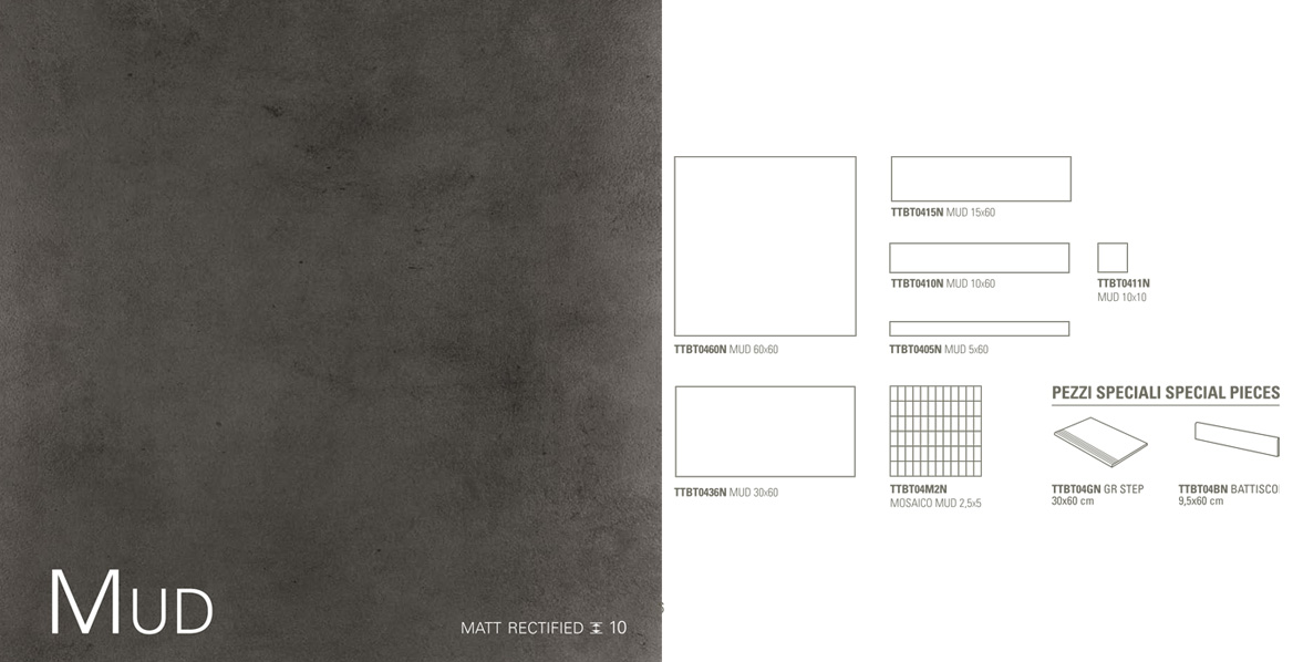 Betontech Mud er en lekker betongflis ifra italienske Terratinta. Mud er en mørkgrå, varm betongfarge.